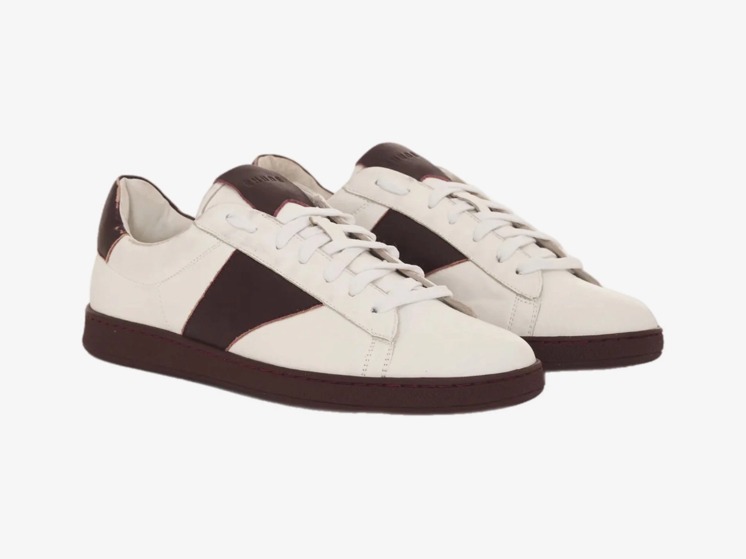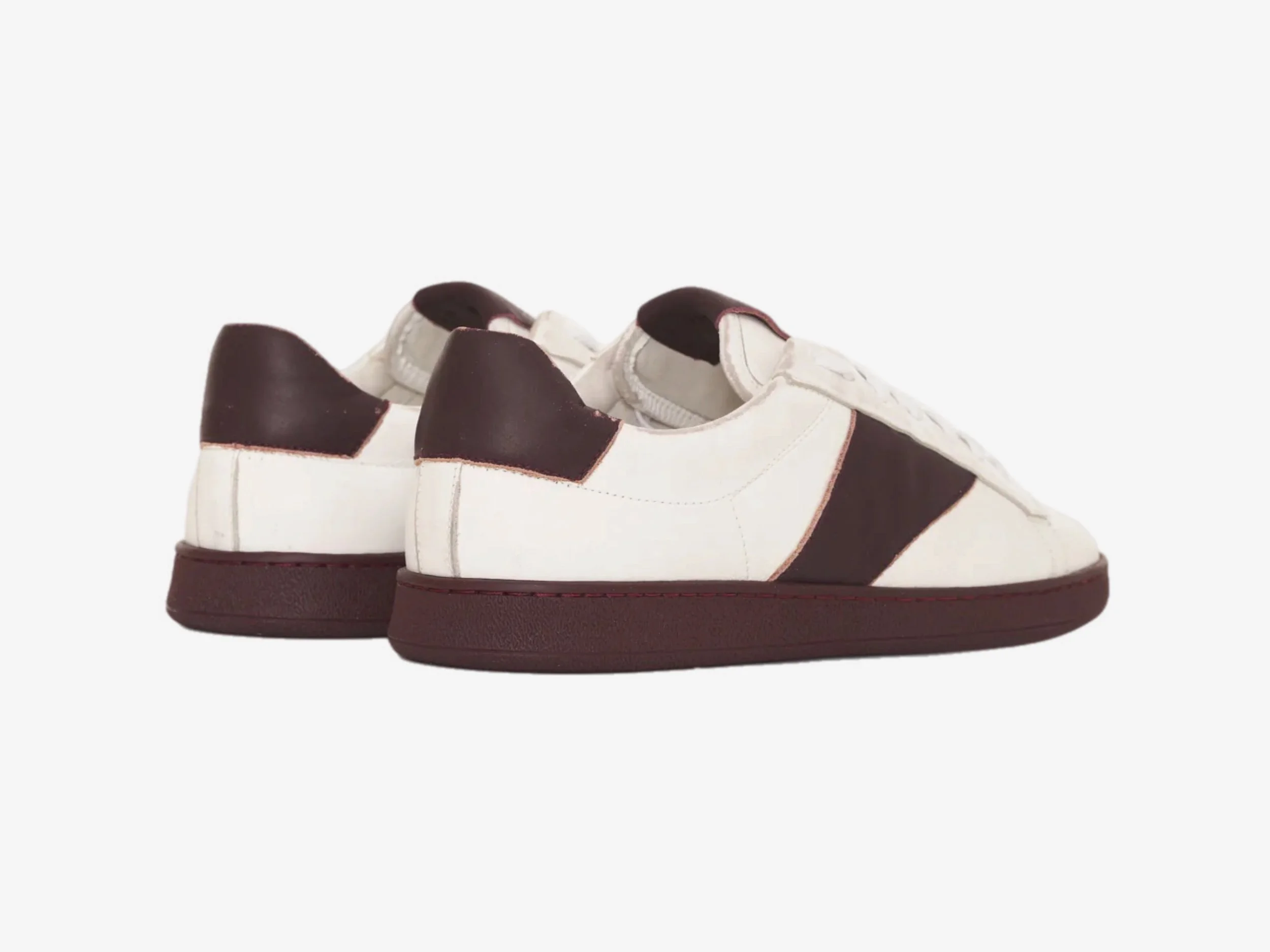 Court sneaker distressed by hand for imperfections throughout. Embossed leather logo patch on tongue, and features a textured rubber outsole.