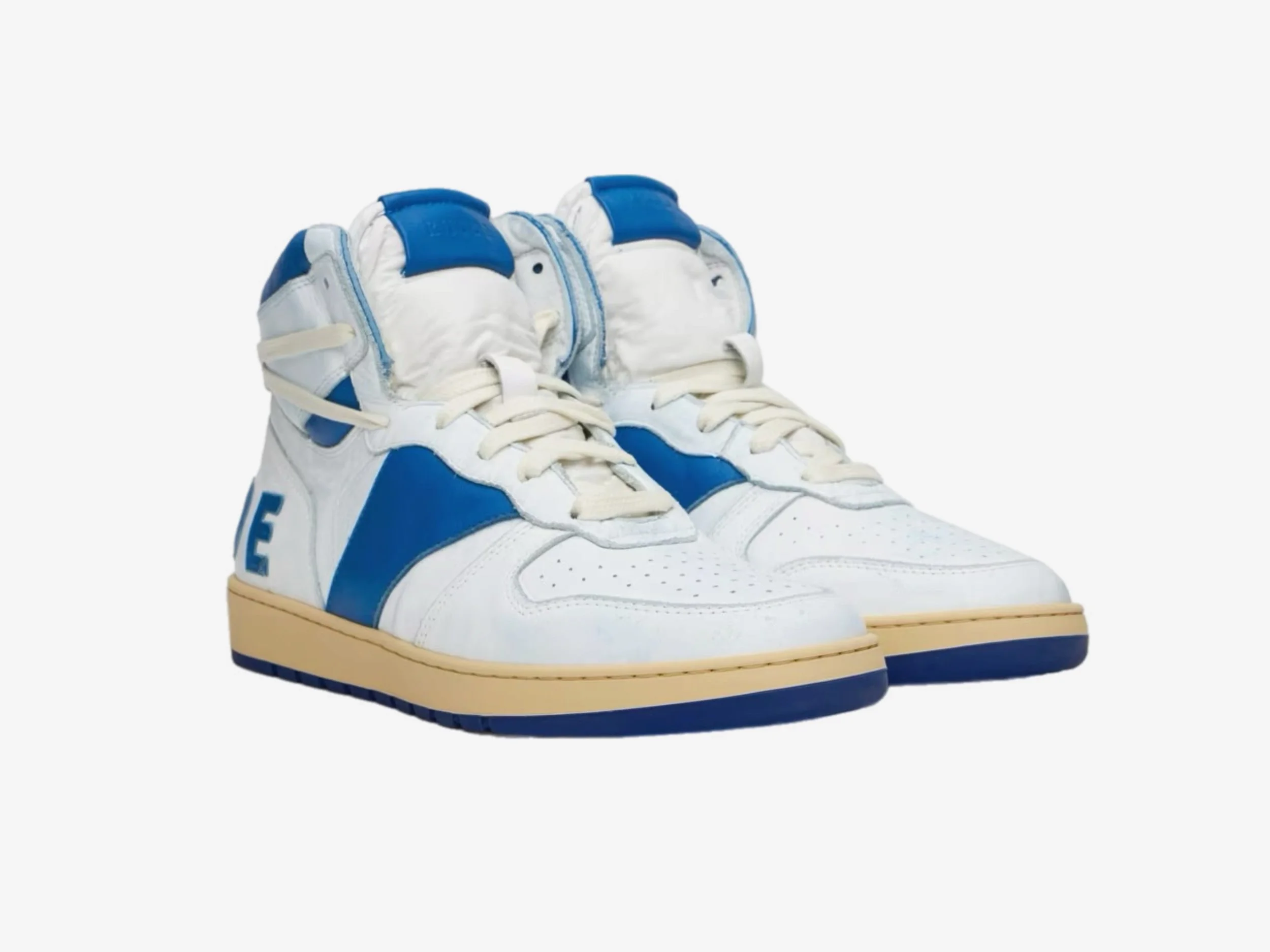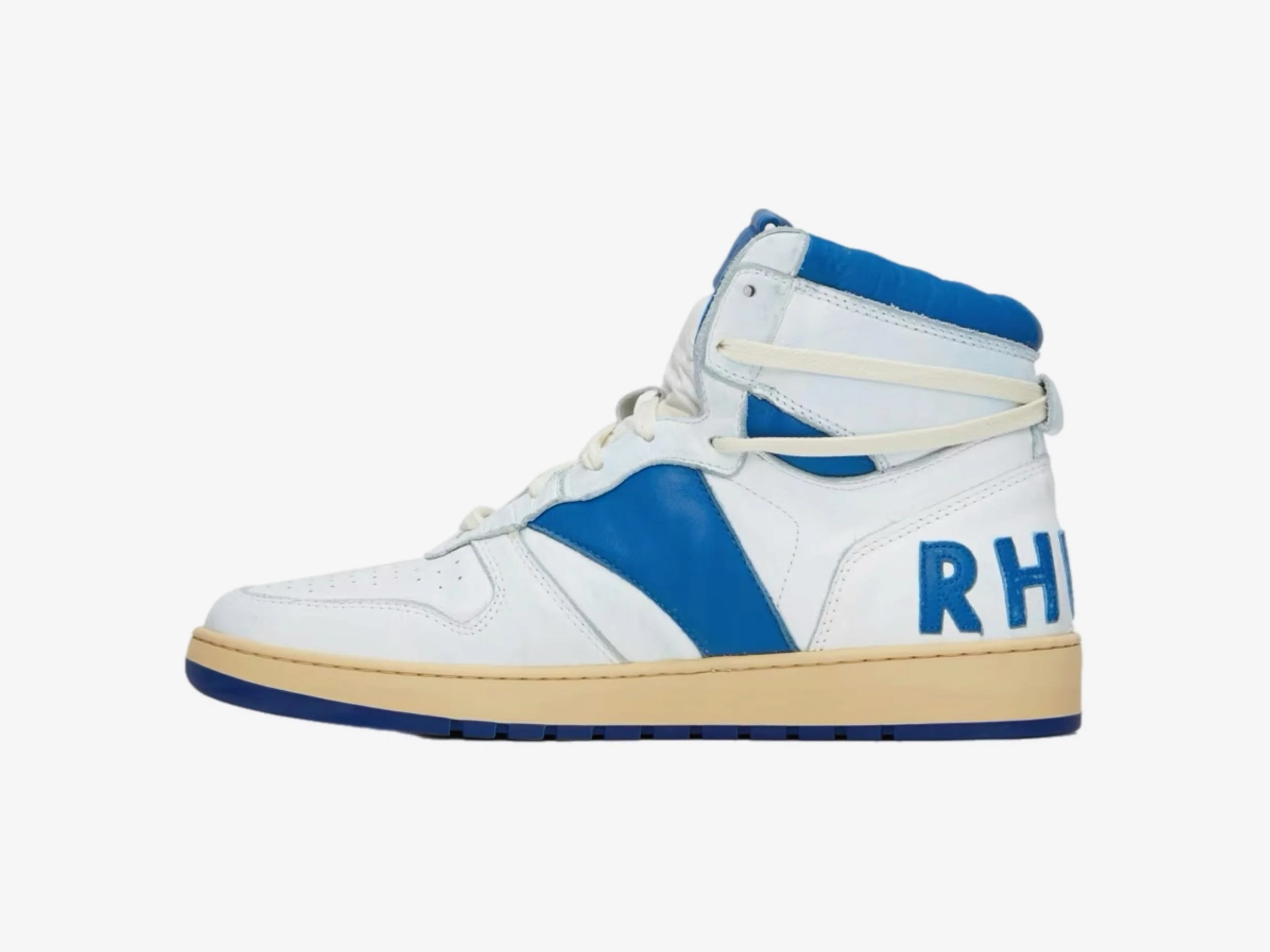 Hi-top leather basketball sneaker with unique wash technique for a vintage look. Calf leather upper, pig leather lining. Hand distressed abrasions and imperfections throughout. Vintaged two-tone rubber outsole. Patch-leather logo on heel.